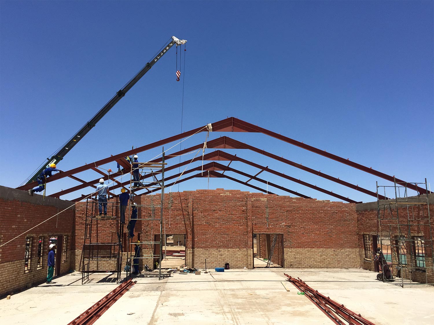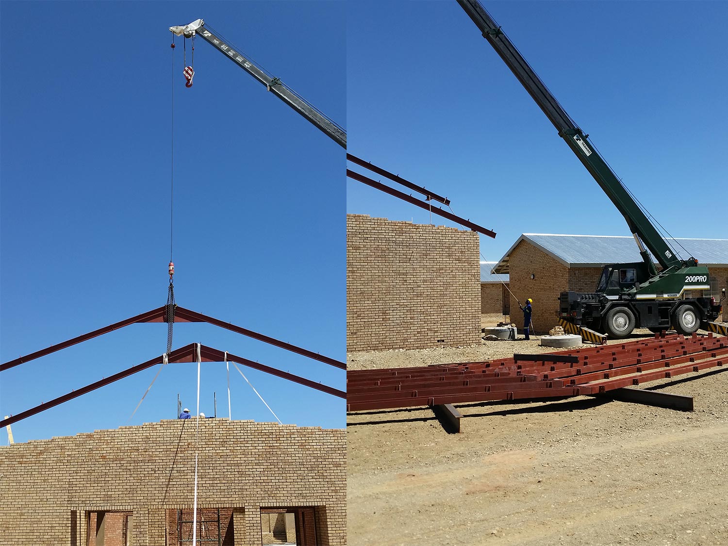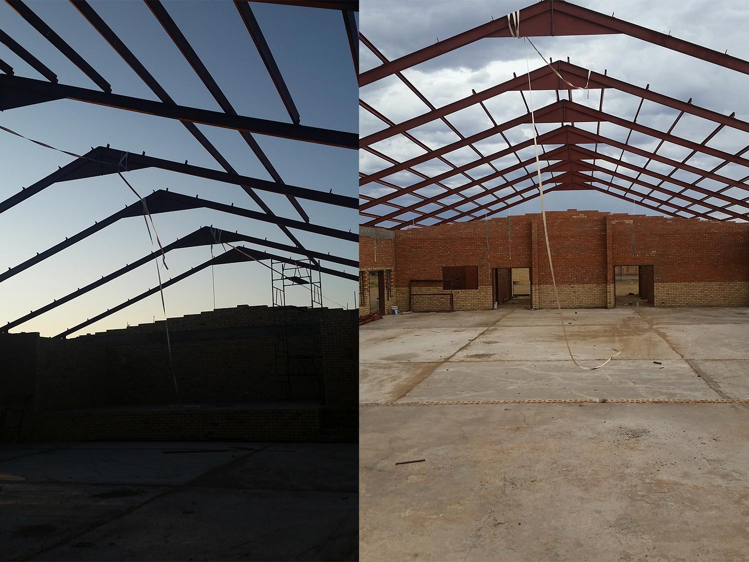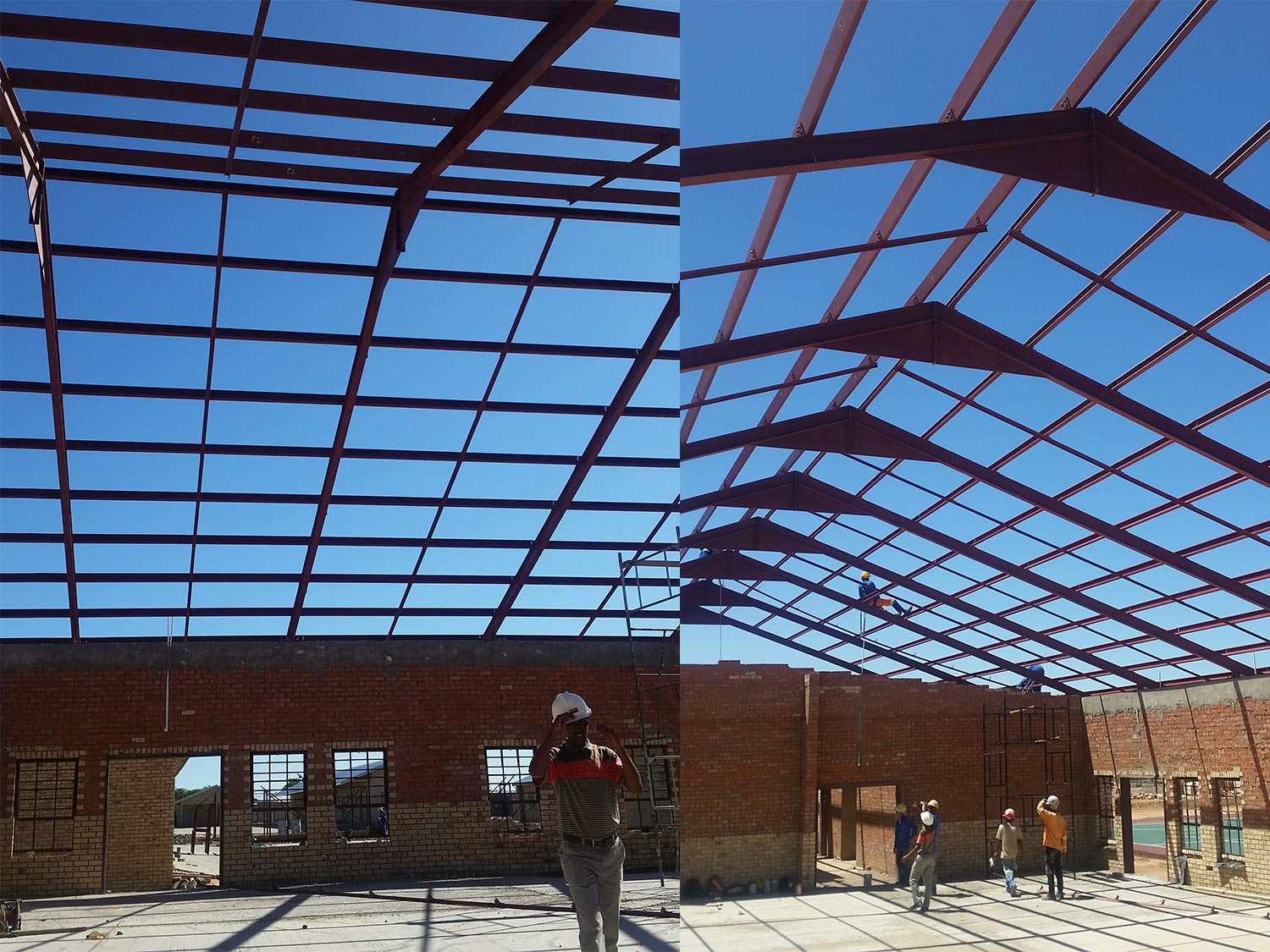 Structural steel roof structure of school hall – 15 tonnes | Erection of steel roof trusses with crane | Erection of steel roof trusses and purlins | Finished roof structure of school hall