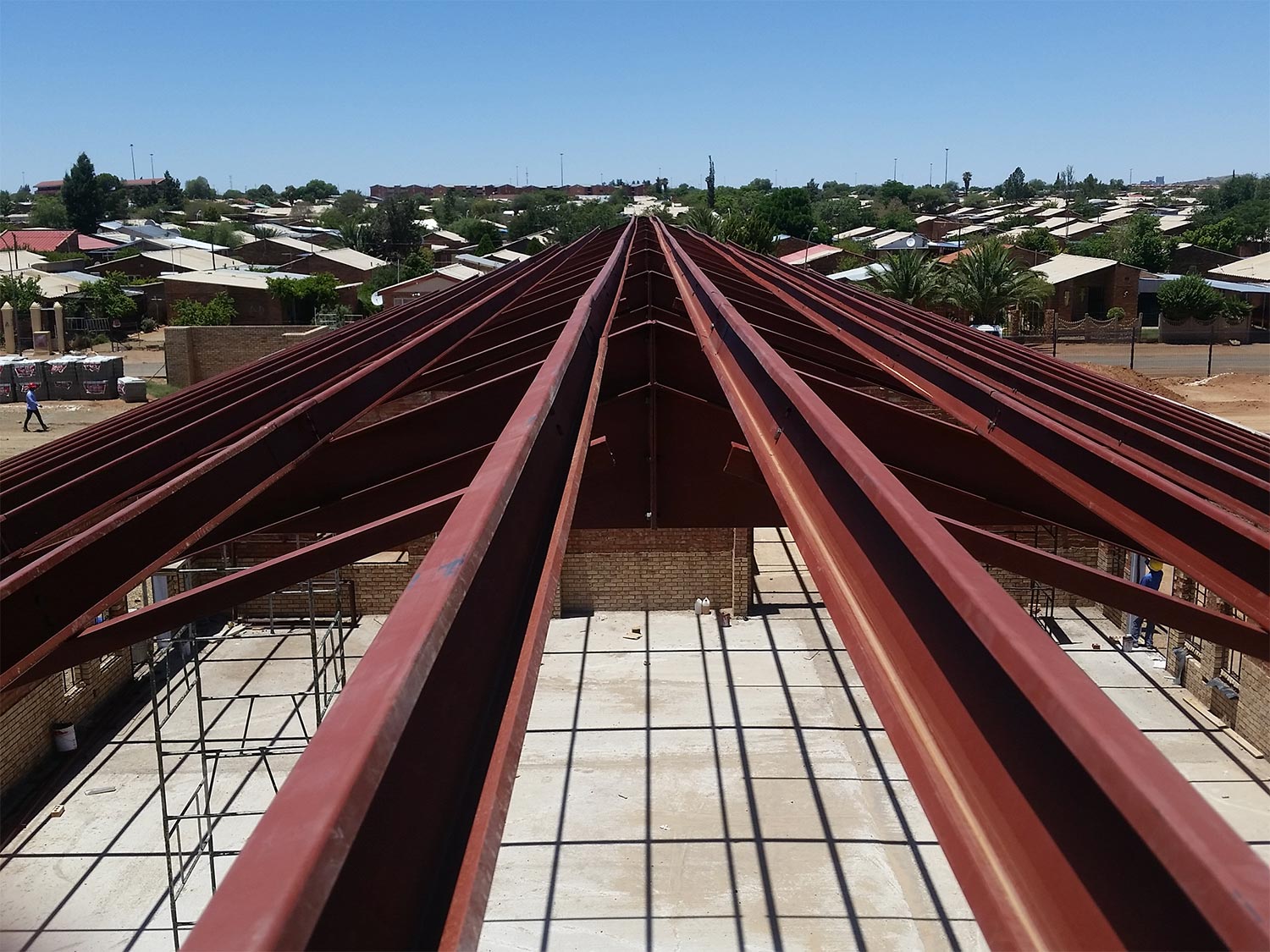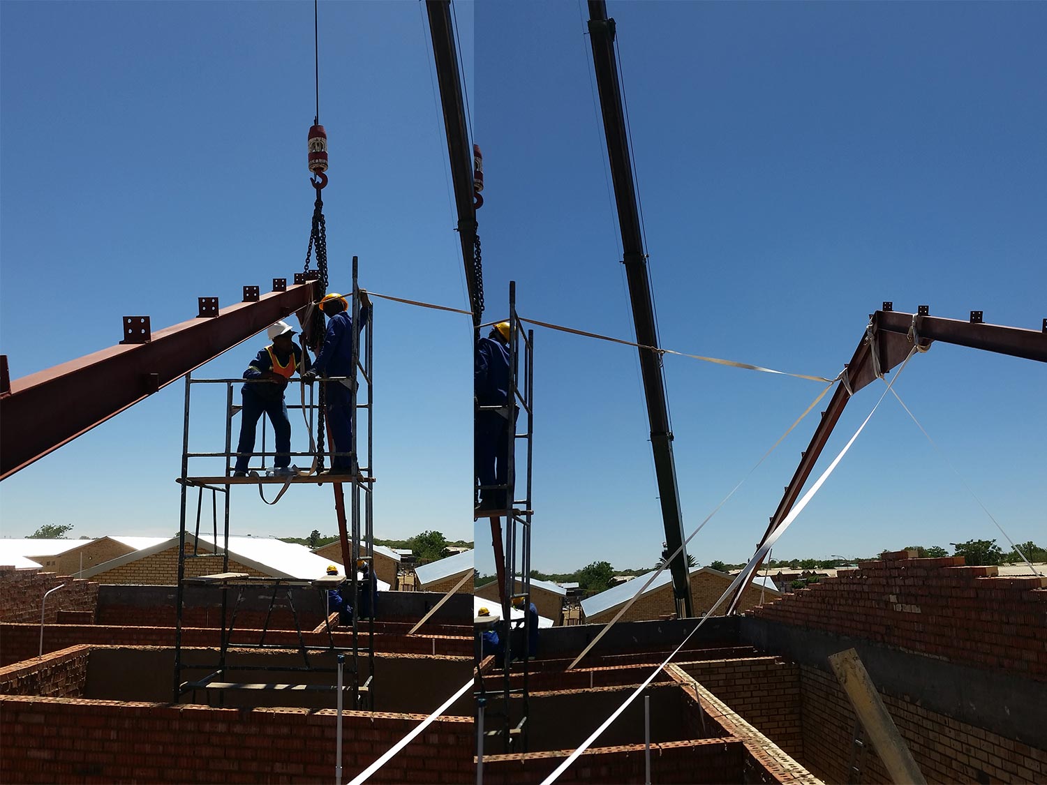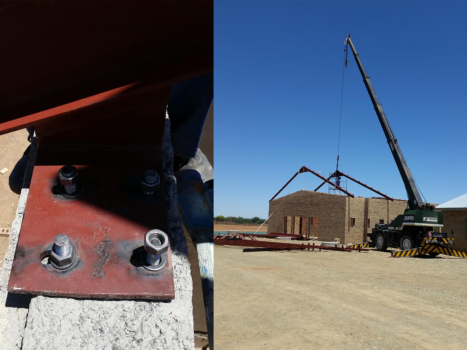 Structural steel roof structure of school hall – 15 tonnes | Erection of steel roof trusses with crane | Erection of steel roof trusses and purlins | Finished roof structure of school hall